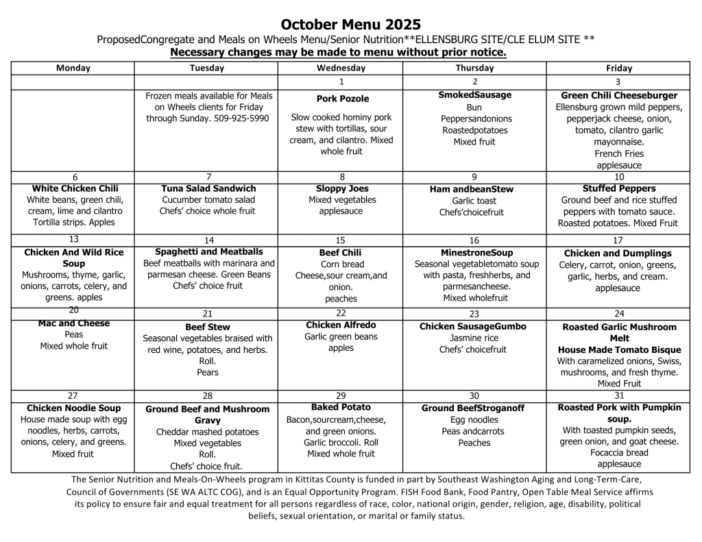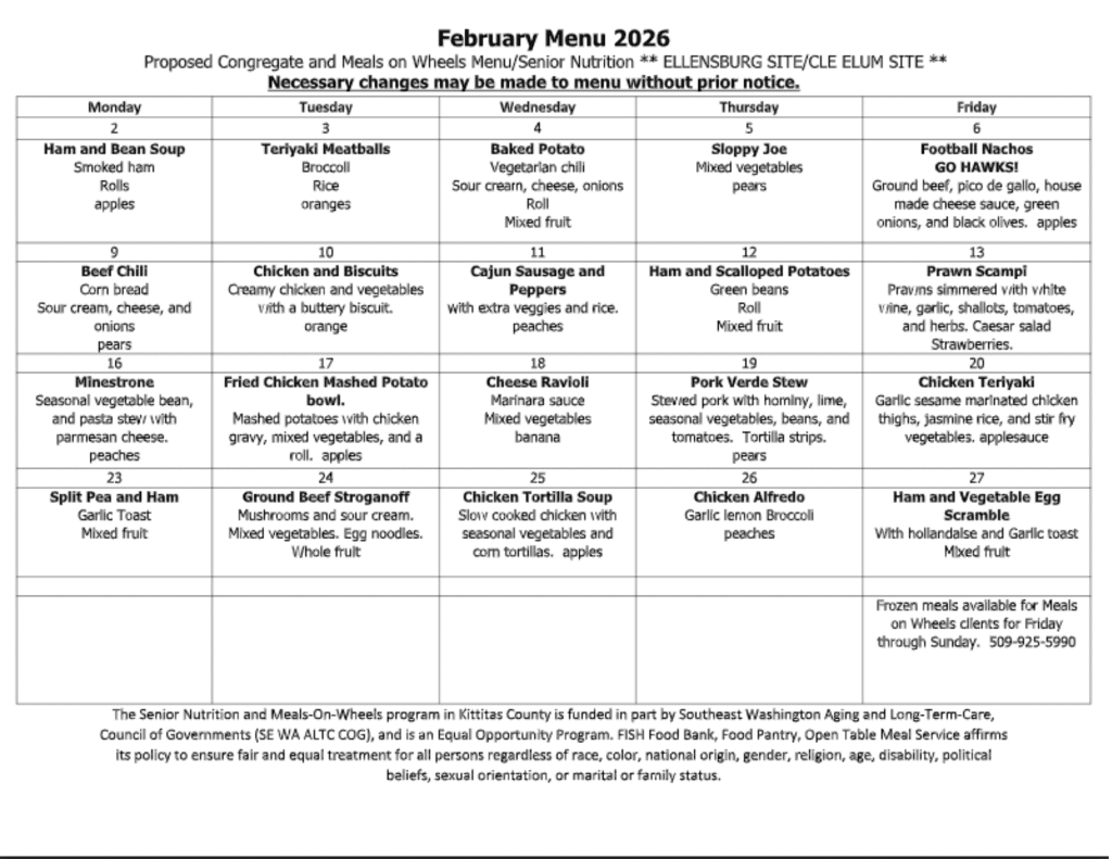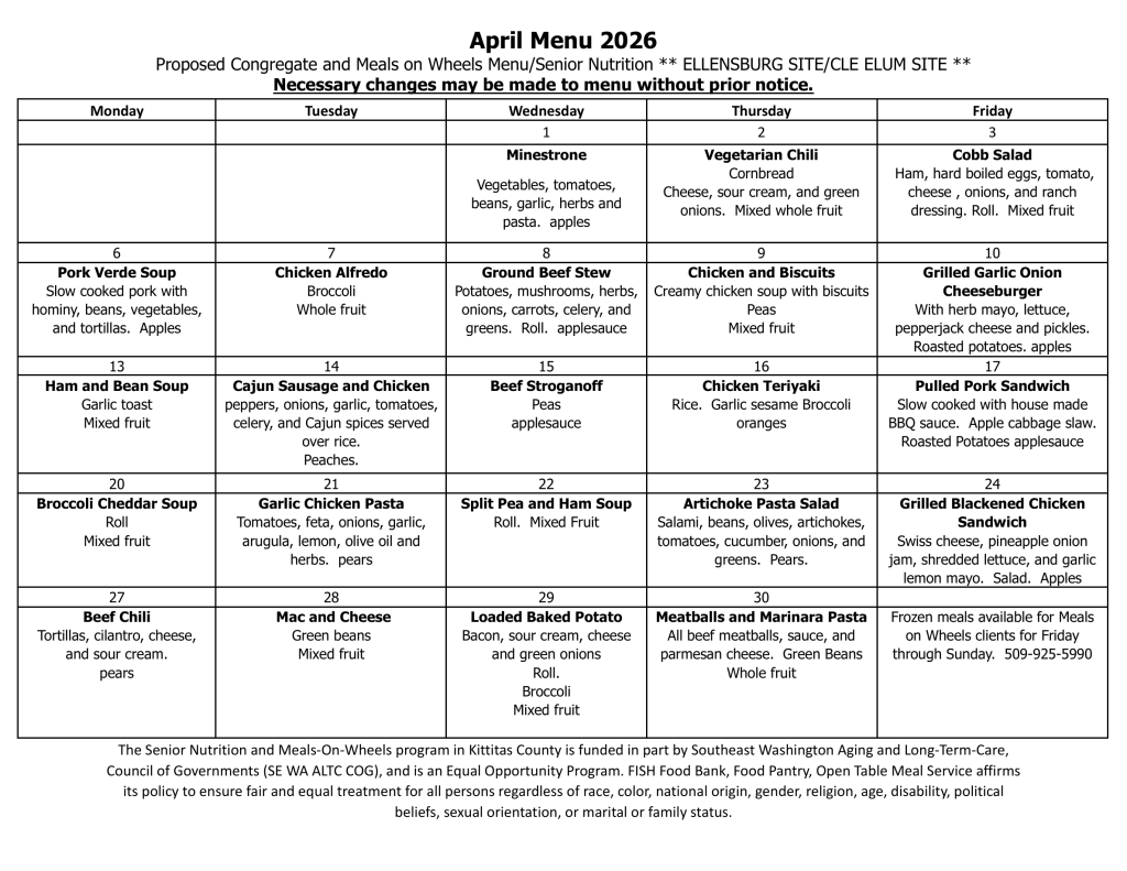We invite all Kittitas County seniors 60+ to have lunch with us, free of charge, Monday-Friday in both Ellensburg and Cle Elum. Donations are gratefully accepted but not required. Prior registration is necessary. Please see Open Table Lunches for more information.